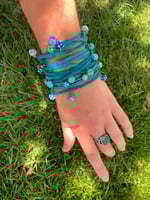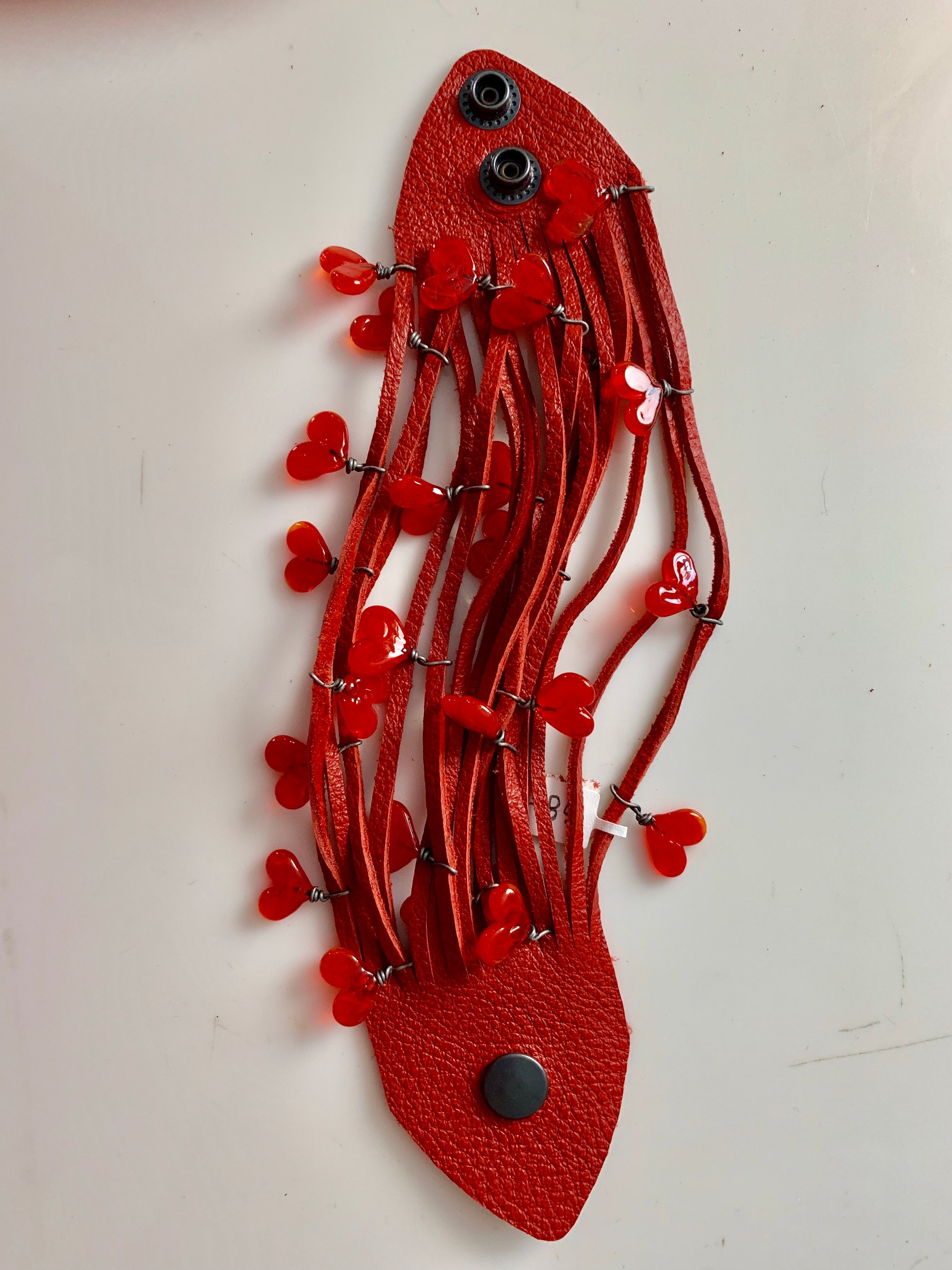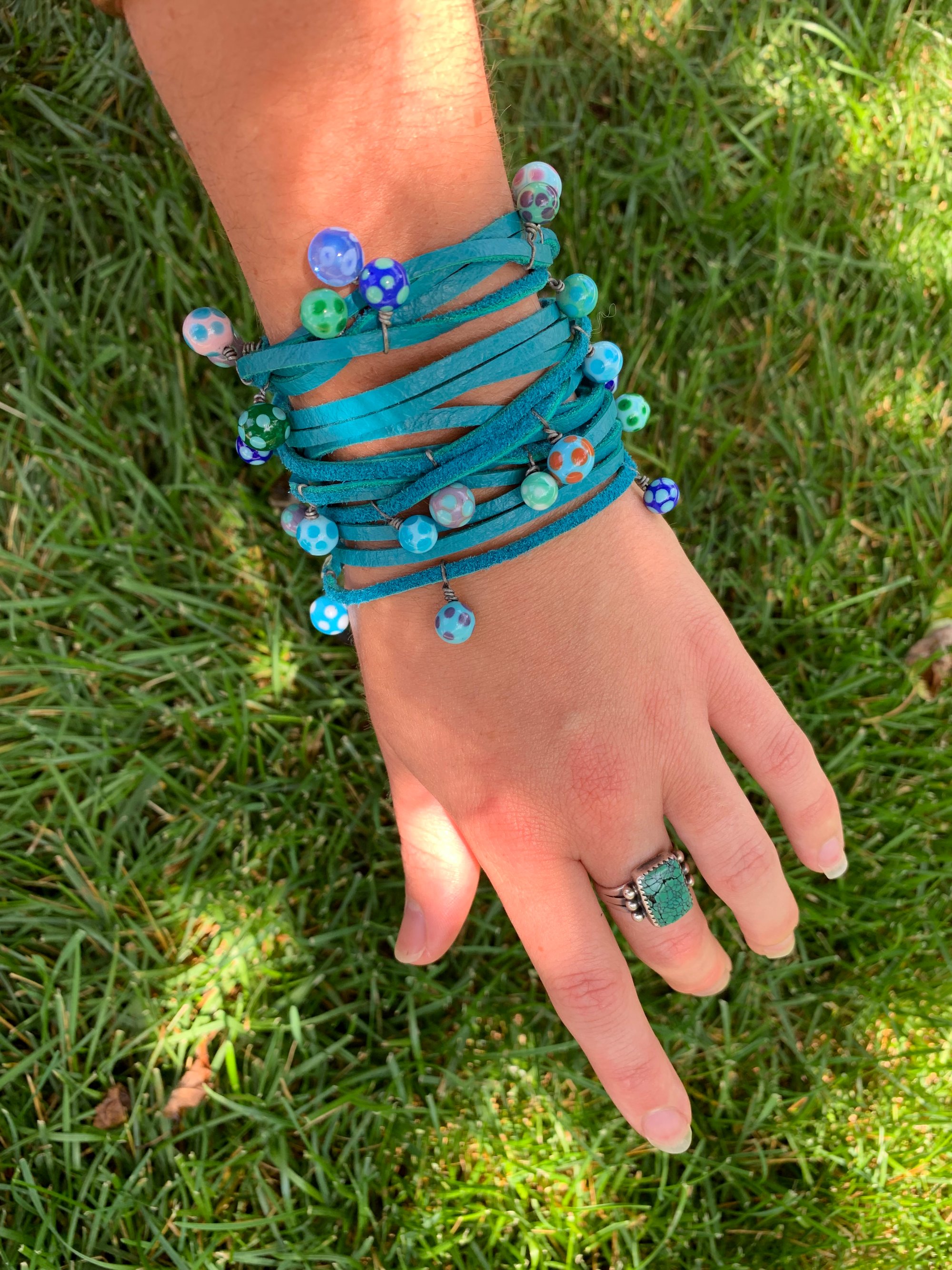 This fun-to-wear leather bracelet will, for sure, be an eye catcher. It fetures two snaps to accommodate different sizes.