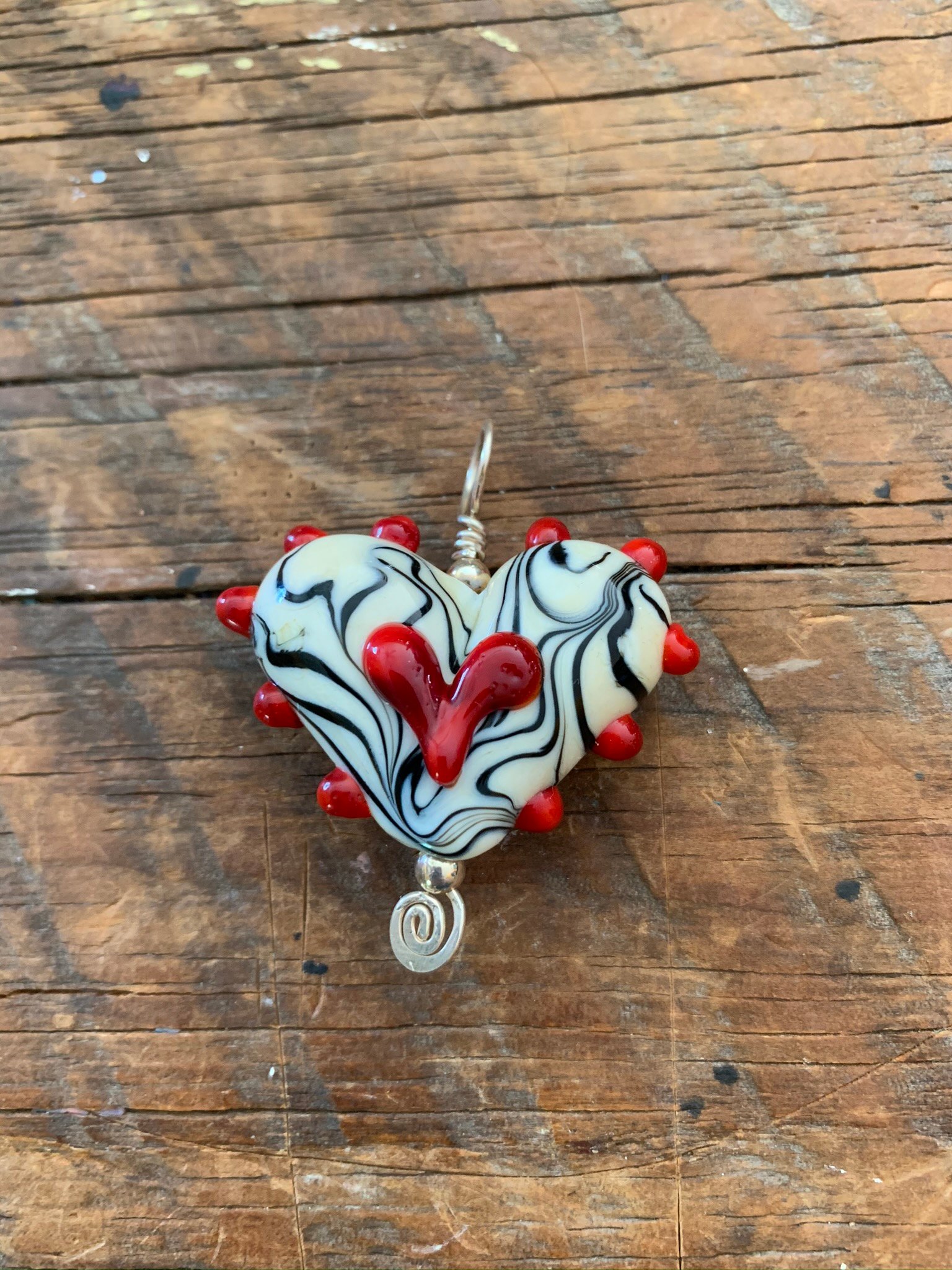Black and ivory zebra heart with red accents. Lamp worked glass heart with sterling silver findings that can be worn on most any necklace.